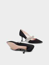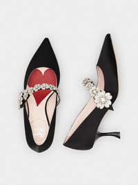 The Bouquet Strass buckle draws inspiration from elements of antique jewelry. Its enchanting crystal flowers adorn the strap of these elegant pumps with tapered toe. Handcrafted in satin, these jeweled shoes feature the distinctive heart on the insole. Description & details Made in Italy Silk blend satin upper Tapered toe Front strap Crystal flowers Leather insole with heart-shaped insert Lacquered heel 2.6 ins Leather outsole Maintenance and care cards included Branded dustbag Mod: RVW61836220RS0B999