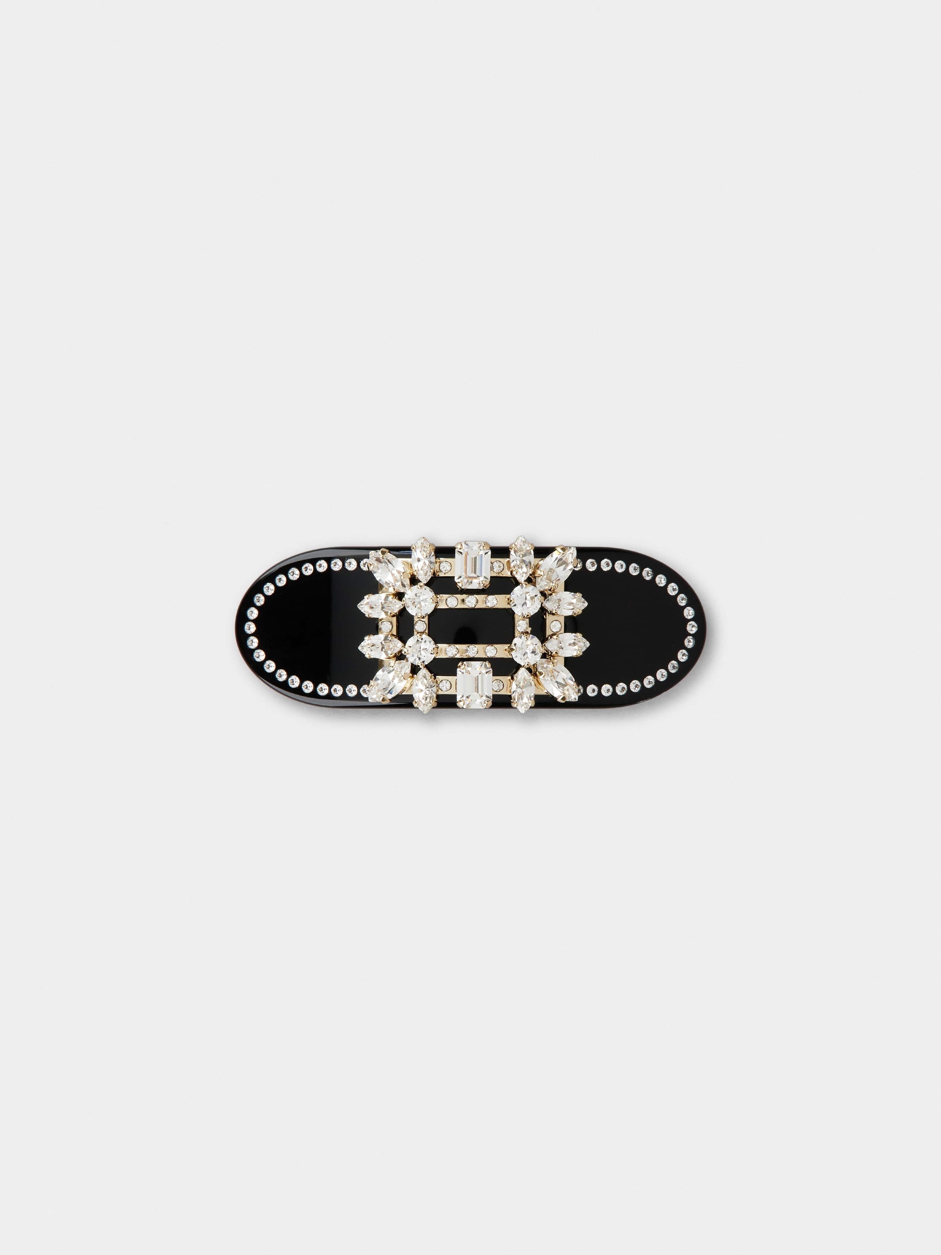 Inspired by the beautiful gardens of the Château de Versailles, the Broche Vivier collection showcases the same exquisite symmetry with its detailed crystal buckle. The Broche Vivier Buckle Hair Clip comes with this distinct Maison signature. Wear this refined accessory and add a shiny touch to your hairstyle. Description & details Made in France Item crafted in cellulose acetate Crystal buckle Rhinestone piping Metal clip Dimensions: 3.1 x 1.2 ins Maintenance and care cards included Mod: REWAC150101AGKB999