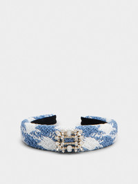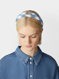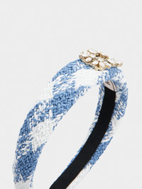 Inspired by the gardens of the Château de Versailles, the Broche Vivier collection showcases the same exquisite symmetry with its detailed crystal buckle. Crafted in bouclé fabric with macro Vichy pattern, this hairband is adorned with this distinctive emblem of the Maison. Description & details Item crafted in bouclé fabric Vichy pattern Crystal buckle Maintenance and care cards included Mod: REWAC140100T0VU218