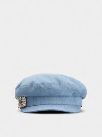 Inspired by the gardens of the Château de Versailles, the Broche Vivier collection showcases the same exquisite symmetry with its detailed crystal buckle. This sailor cap in denim is adorned with this emblem of the Maison. An accessory with a feminine and youthful mood, enhanced by the distinctive Vivier touch. Description & details Made in Italy Item crafted in denim Crystal buckle Roger Vivier logo stitched on the inside Maintenance and care cards included Mod: RQWH0140100JDLU207