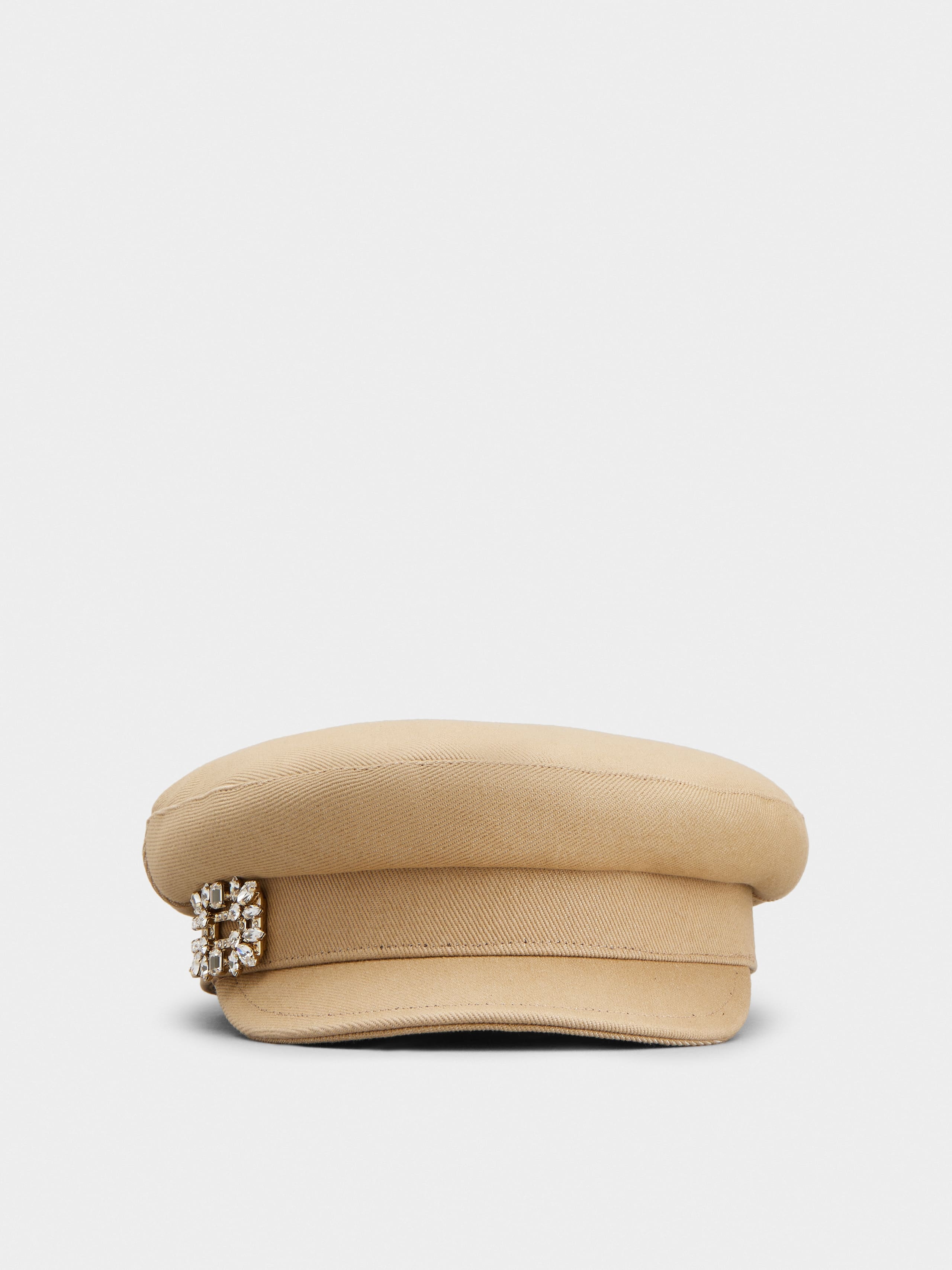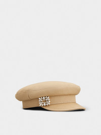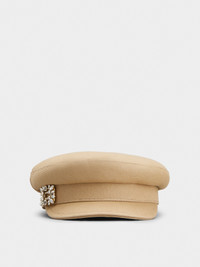 Inspired by the gardens of the Chateau de Versailles, the Broche Vivier collection showcases the same exquisite symmetry with its detailed crystal buckle. This sailor cap in denim is adorned by this distinctive emblem of the Maison. An accessory with a feminine and youthful mood, embellished with the distinctive Vivier touch. Description & details Denim fabric Crystal buckle Roger Vivier logo on the inside Mod: RQWH0140100DASC609
