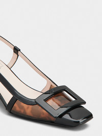 Launched in 1965, the Belle Vivier is one of the Maison's most famous designs. Becoming an icon thanks to its buckle and Skyscraper heel, its reinterpretations make it a new classic. Crafted in patent leather and PVC at our ateliers, these refined slingback pumps are the perfect ally of your days. Description & details Patent leather Tortoiseshell PVC inserts Lacquered buckle Heel strap Leather insole Leather outsole Covered Skyscraper heel Heel height 1.8 ins Made in Italy Mod: RVW00639450TSH4128