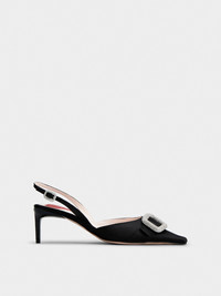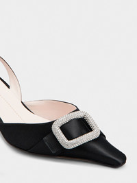 The Viv’ Canard pumps are a mix of iconic elements. Inspired by a design from the Maison's archives, they are characterized by a squared tapered toe. The strap is adorned with the mini crystal rounded buckle. The lacquered stiletto heel is embellished with the embossed Roger Vivier logo, while the insole comes with the emblematic heart. This elegant handcrafted creation comes here in silk blend satin. Description & details Silk blend satin upper Squared tapered toe Crystal buckle Heel strap Leather insole with heart-shaped insert Lacquered heel 2.2 ins Leather outsole Maintenance and care cards included Branded dustbag Mod: RVW72237600RS0B999