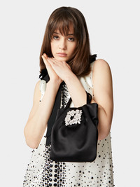The crystal Bouquet Strass buckle takes inspiration from elements of antique jewelry. It is the centerpiece of the Drapé Pocket Bouquet Strass Buckle Micro Bag. Crafted in delicately draped satin, this timeless elegance bag can be carried by hand with the double handle, or over the shoulder with the concealed chain strap in metal. Description & details Made in Italy Item crafted in silk blend satin Crystal buckle Satin interior Dimensions: 6.5 x 7.1 x 1 in, fixed handles, concealed chain strap in metal Maintenance and care cards included Branded dustbag Mod: RBWANVK0000RS0B999