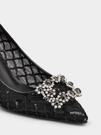 The Efflorescence pumps are embellished by the emblematic jewel buckle with crystal flowers. Handcrafted in net fabric, with sequins and patent leather piping, they are a timeless style, for your most exclusive soirées. Description & details Net fabric with sequins Patent leather detailing Crystal buckle Leather insole Leather outer sole Sin heel Heel height 2.6 ins Made in Italy Mod: RVW41421660TRJB999