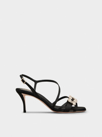 The Efflorescence sandals are embellished by the emblematic jewel buckle with crystal flowers. Handcrafted in satin with heel strap, they are a timeless style, for your most exclusive soirees. Description & details Silk blend satin Crystal buckle Heel strap Suede detailing Satin insole Leather outer sole Covered buckle Heel height 2.6 ins Made in Italy Mod: RVW80844460RS0B999