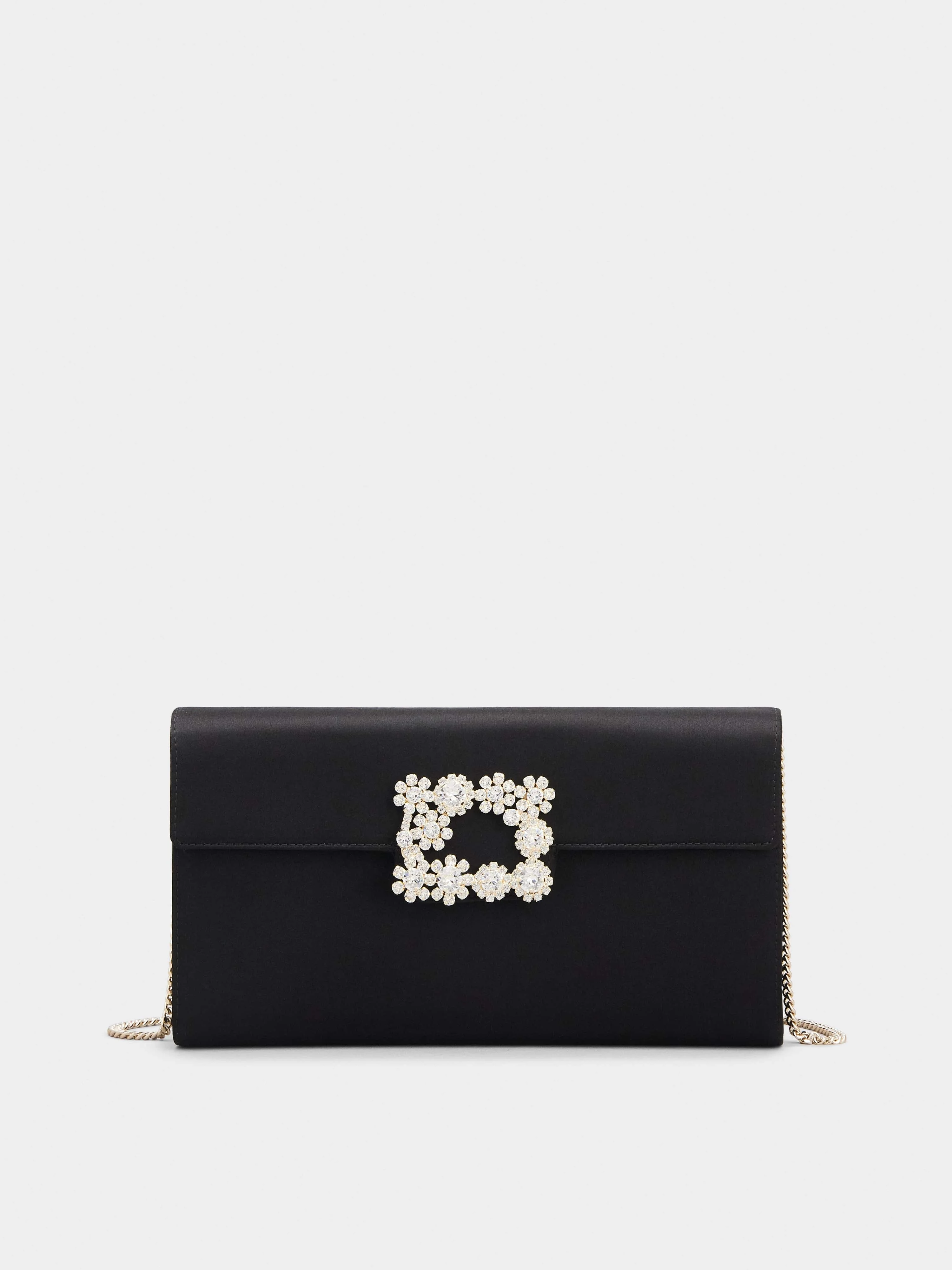 The Flower Buckle in multi-colored gemstones give a subtle hint of fun to this exquisite satin clutch with a thin metal chain strap - a precious accessory for grand occasions. Description & details Made in Italy Item crafted in satin Flower Buckle in rhinestones Dimensions: 9.5 x 5.2 x 1.4 ins, metal chain strap approx 41.3 ins Maintenance and care cards included Branded dustbag Mod: RBWAMFD0200RS0B999