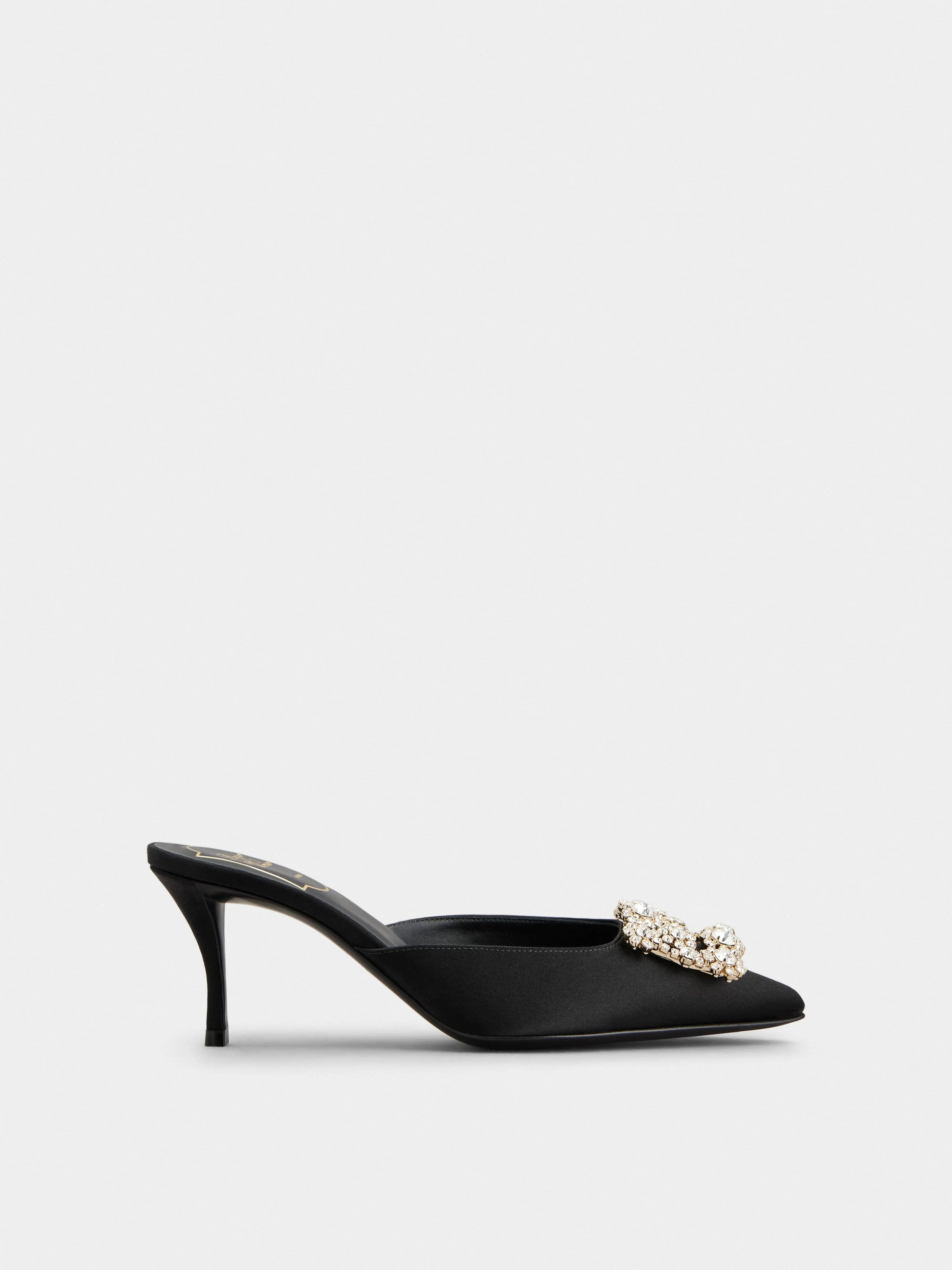 The Efflorescence mules are embellished by the emblematic jewel buckle with crystal flowers. Handcrafted in satin, they are a timeless style, for your most exclusive soirees. Description & details Silk blend satin Crystal buckle Silk blend satin insole Leather outer sole Covered Sin heel Heel height 2.6 ins Made in Italy Mod: RVW41441400RS0B999
