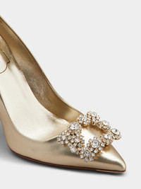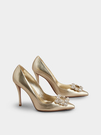 Featuring an elegant covered Sin heel, the Flower Strass Pumps are enhanced by an iconic jeweled buckle with crystal flowers. Handcrafted in soft metallic nappa leather, they are a distinctly timeless style, perfect from the red carpet to the most exclusive soirées. Description & details Made in Italy Nappa leather upper Metallic finishing Tapered toe Crystal buckle Leather insole Sin heel 3.9 ins Leather outsole Maintenance and care cards included Branded dustbag Mod: RVW41917620KACG005