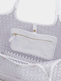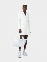 A reference to the Maison’s emblem, the Grand Vivier Bag features a mini-buckle pattern, creating a distinct graphic motif. Finely crafted in PVC with leather, this bag is lightweight, making it the perfect carry-all. Description & details Made in Italy Item crafted in PVC Branded geometric pattern print Leather trimming Charm with mini leather buckle Metal ring, leather hook and snap closure Internal pocket with leather zip puller Dimensions: 18.9 x 11 x 4.7 ins, leather handles Foldable to fit easily into luggage Maintenance and care cards included Branded dustbag Mod: RBWAOCA330049W0518