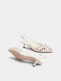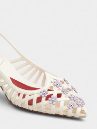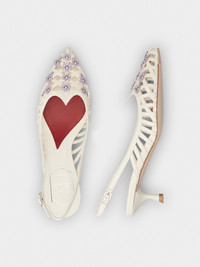 The I Love Vivier collection celebrates the theme of love. The heart-shaped silhouette peeks out from the insole and defines the outline of the top edge of these slingback pumps in leather, featuring floral decorations. With their elegant and distinctive silhouette, they express a contemporary allure, under the sign of joie de vivre. Description & details Ovine leather Floral decorations wit studs Heel strap Leather insole with heart-shaped insole Lacquered heel 1.8 in Leather outer sole Made in Italy Mod: RVW54342550UET1N21
