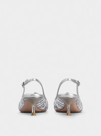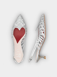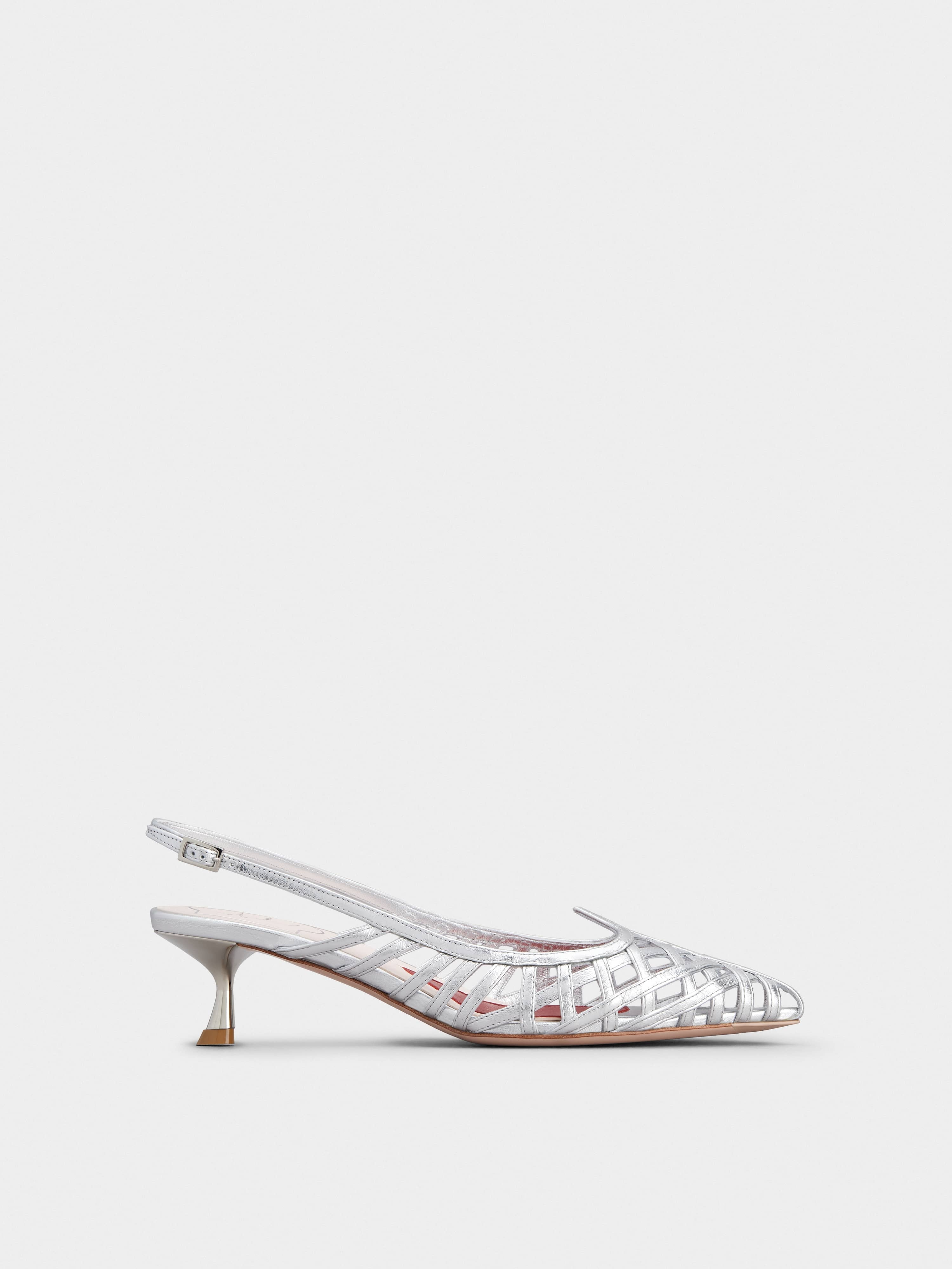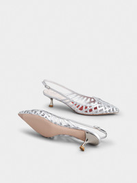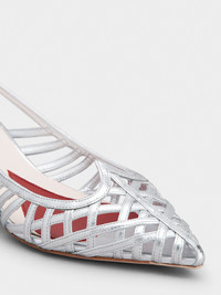 Slingback pumps in leather with tapered toe, characterized by thin woven straps and shaped upper piping. Sophisticated, fresh and comfortable at once, they come with the distinctive heart-shaped insert on the insole. Description & details Leather upper Metallic finishing Ankle strap Leather insole wit heart-shaped insert Lacquered heel 1.8 ins Leather outsole Maintenance and care cards included Branded dustbag Mod: RVW54338590T0HB200