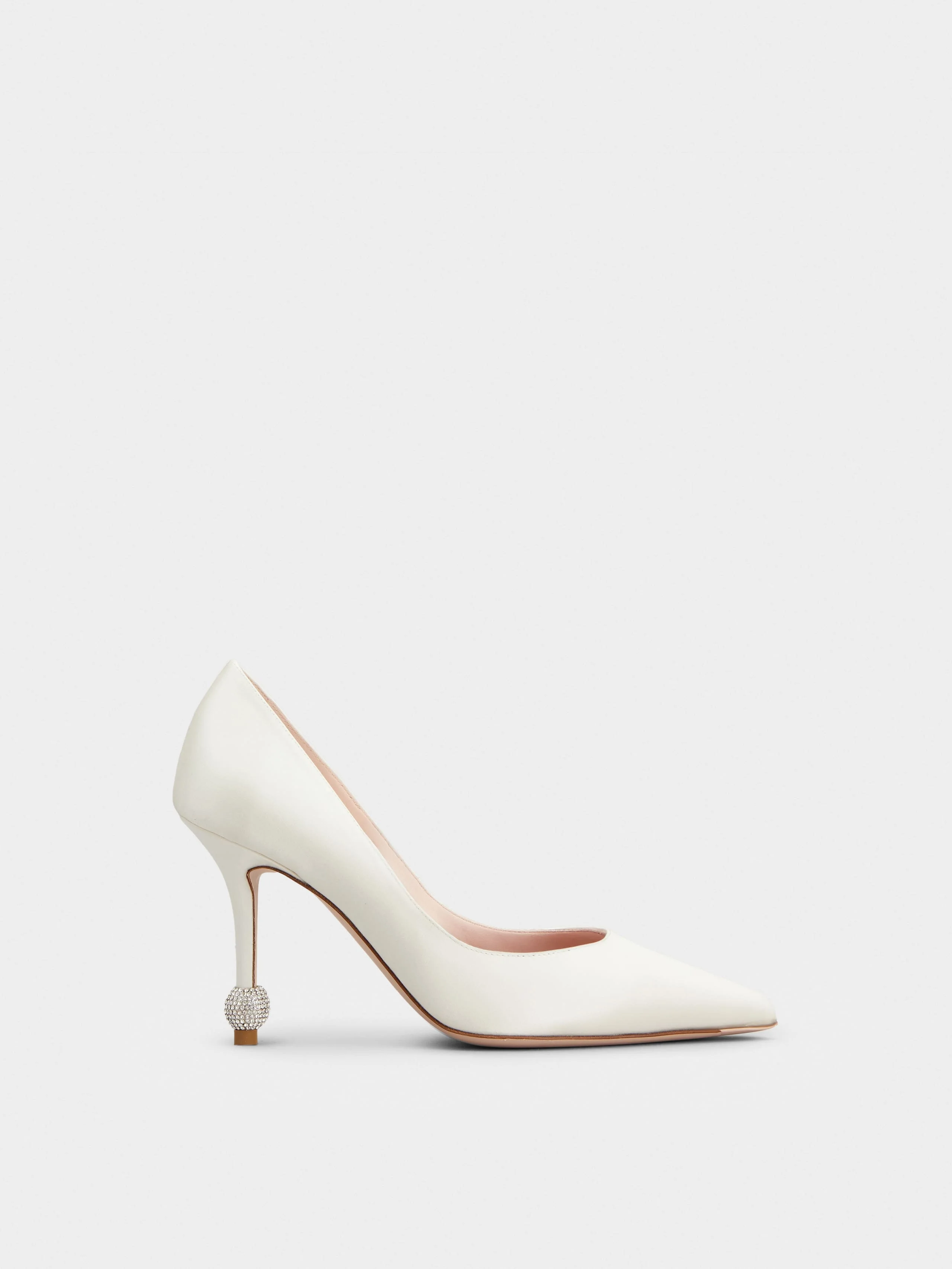 Embellished with a boule heel, these pumps in satin embody refinement. Their emblematic heart, delicately placed on the insole, adds a sophisticated and irresistibly charming touch to your allure. Description & details Silk blend satin Leather insole with heart-shaped insert Covered heel 3.3 ins Crystal boule Leather outer sole Made in Italy Mod: RVW78943010RS0C001