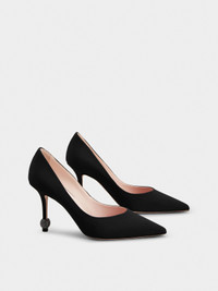 Embellished with a boule heel, these pumps in grosgrain embody refinement. Their emblematic heart, delicately placed on the insole, adds a sophisticated and irresistibly charming touch to your allure. Description & details Fabric Leather insole with heart-shaped insert Covered heel 3.3 ins Crystal boule Leather outer sole Made in Italy Mod: RVW789430106N1B999