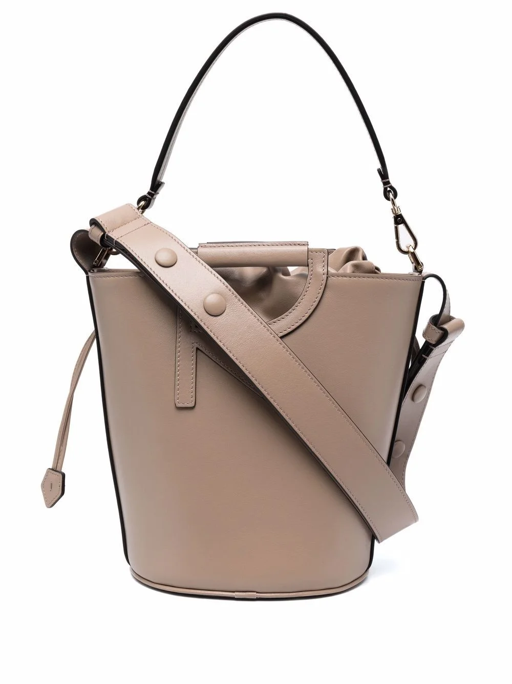 logo-embellished bucket bag beige leather logo embellishment single top handle detachable shoulder strap main compartment drawstring fastening Made in Italy Composition Outer: Leather 100% SIZE & FIT Model measurements Height 5 ft 10 in(1.78 m) Bust/Chest 33.07 in(84 cm) Hips 36.61 in(93 cm) Waist 24.8 in(63 cm) Measurement DEPTH 5.9 in(15 cm) HANDLE 7.08 in(18 cm) HEIGHT 8.66 in(22 cm) STRAP 11.02 in(28 cm) MAXIMUM WIDTH 9.84 in(25 cm) MINIMUM WIDTH 6.69 in(17 cm)