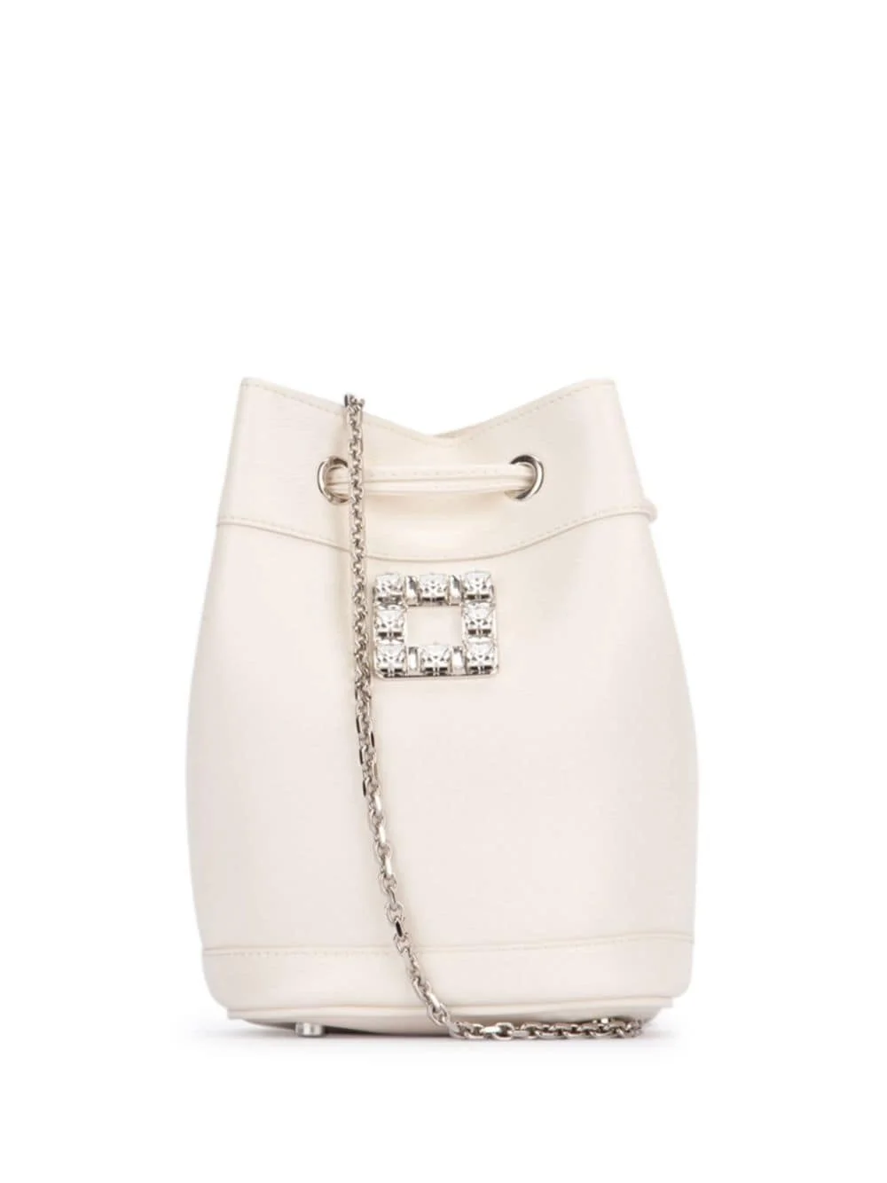 mini bucket bag Highlights - Cream white - Calf leather - Crystal buckle detail - Chain-link shoulder strap - Top drawstring fastening - Main compartment - Metal feet Made in Italy Composition Outer: Metal 100%, Crystal 100%, Calf Leather 100% Lining: Fabric 100% SIZE & FIT Measurement DEPTH 3.93 in(10 cm) HEIGHT 6.69 in(17 cm) WIDTH 6.69 in(17 cm)