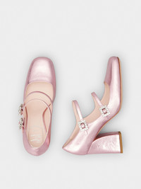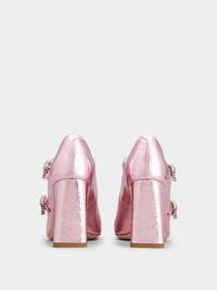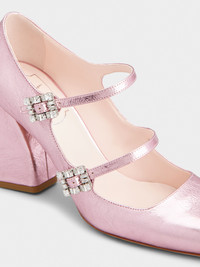 Inspired by the Belle Vivier, the Très Vivier collection is now an icon on its own. Crafted in crinkled look metallic leather, the Mini Très Vivier Strass Buckle Babies Pumps come with two straps embellished with mini crystal buckles. A sophisticated and comfortable style, with high geometric heel with Sixties references. Description & details Made in Italy Leather upper Crinkled effect metallic finishing Rounded toe Double front strap Mini crystal buckles Leather insole Heel 3.3 ins Leather outsole Maintenance and care cards included Branded dustbag Mod: RVW52235690T0HL203