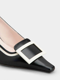 Inspired by a design from the archive, the Viv' Canard slingback pumps in leather combine different iconic elements and the savoir-faire of the Maison. They are distinguished by a tapered squared toe and a lacquered buckle. The heel comes with an embossed Roger Vivier logo, while the emblematic heart signs the insole. The final touch to a metropolitan women's allure. Description & details Calfskin leather Lacquered buckle Ankle strap Leather insole with heart-shaped insert Leather outer sole Lacquered kitten heel Heel height 2.2 ins Made in Italy Mod: RVW72240720CH50G45