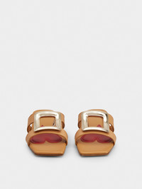 The Viv' Choc buckle, with its distinctive rounded shape, adorns these mules in leather with leather outer sole. Characterized by a squared toe, this versatile summer creation is complemented by the emblematic heart-shaped insole. Description & details Calfskin leather Metal buckle Leather insole with heart-shaped insert Leather outer sole Made in Italy Mod: RVW74738070D90S002