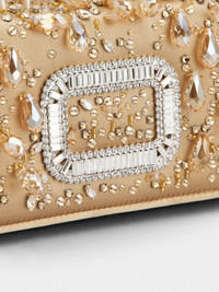 The iconic Pilgrim buckle is adorned with baguette crystals that give it all its sparkle. The crystals are applied by hand, using a high jewelry technique. This micro bag in satin, with a removable metal chain, ensures elegance for any occasion. Description & details Dimensions: L 7.1 ins x H 4.1 ins x D 2.4 ins Silk blend satin Teardrop crystal and bead decorations Fixed handle Removable metal chain Crystal buckle Magnetic button closure Internal pocket Made in Italy Mod: RBWABDH1000RS0C603