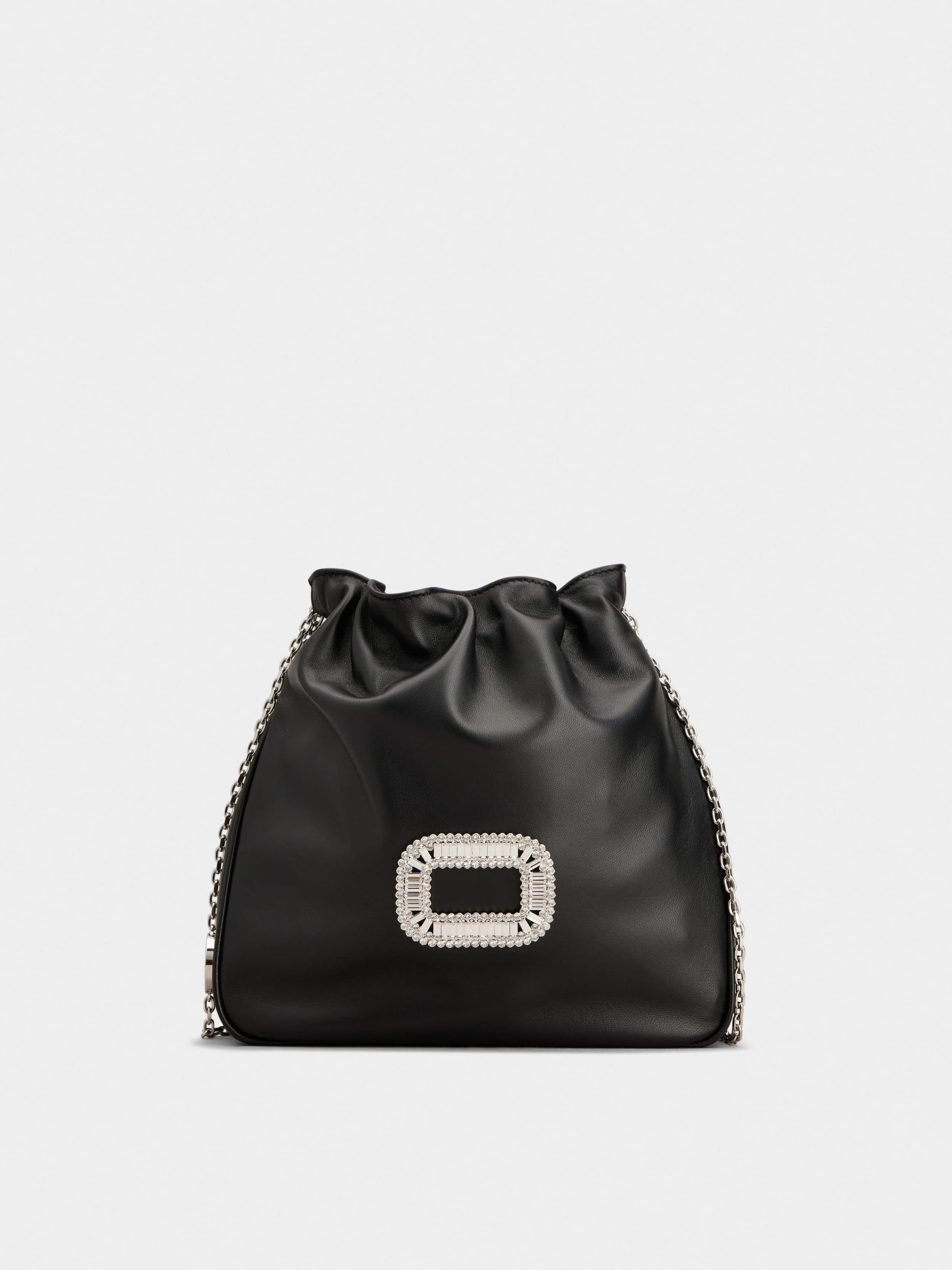 The iconic Pilgrim buckle is adorned with baguette crystals that give it all its sparkle. The crystals are applied by hand, using a high jewelry technique. This mini bag in nappa leather, with double metal chain that works as shoulder strap, ensures elegance for any occasion. Description & details Dimensions: L 9.1 ins x H 8.3 ins x D 2 ins Ovine nappa leather Metal double chain with RV charm Crystal buckle Satin lining Internal pocket Made in Italy Mod: RBWABDK0100YDRB999
