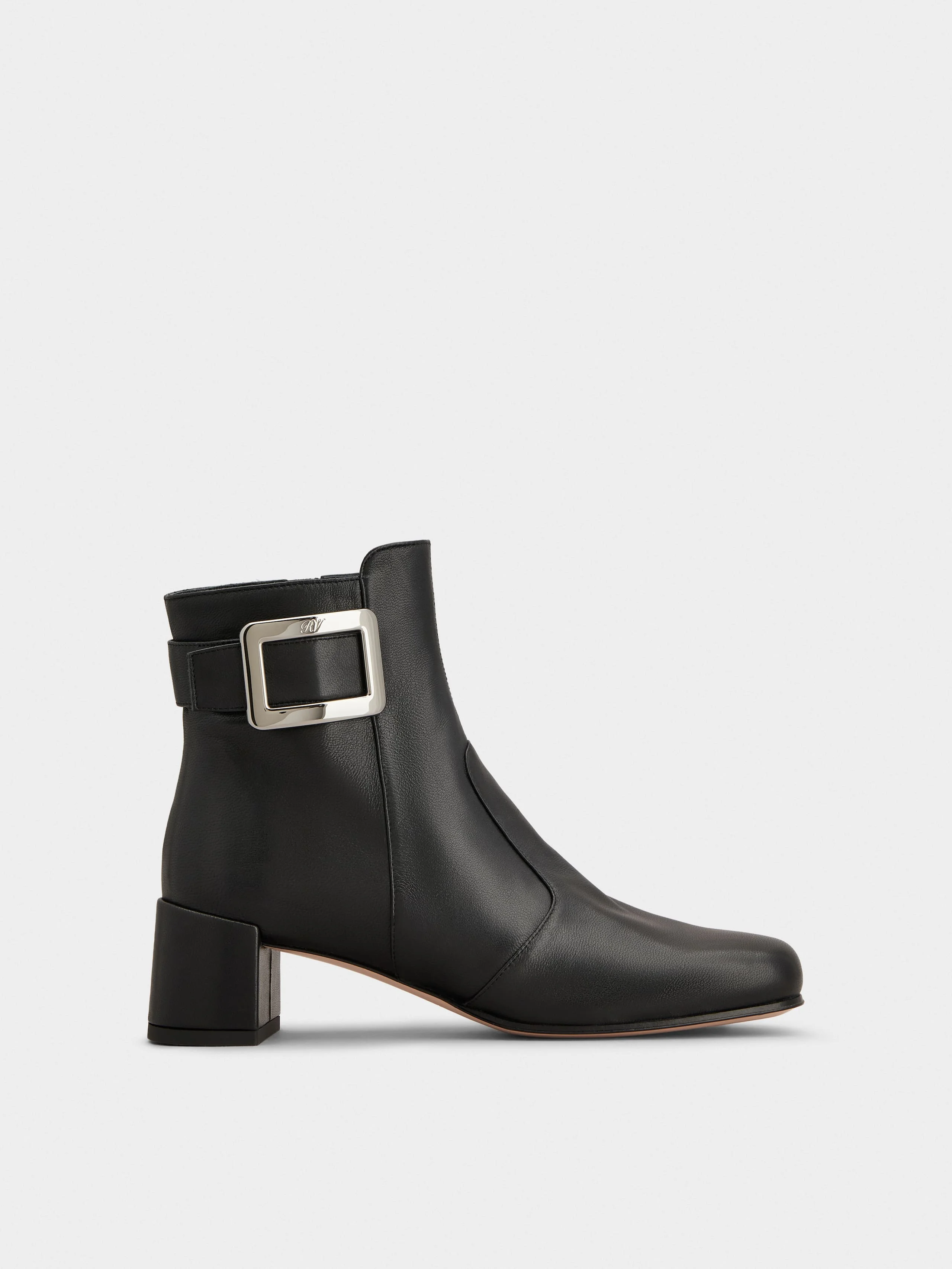 Evoking the spirit of the Sixties with their iconic buckle and covered heel, the Polly booties in nappa leather combine refined comfort with sophisticated allure. Designed for the urban woman, they embody a timeless style and effortless elegance at every step. Description & details Ovine leather Metal side buckle Zip on the inside Leather lining and insole Leather outer sole Covered geometric heel Heel height 1.8 ins Made in Italy Mod: RVW7514366091TB999