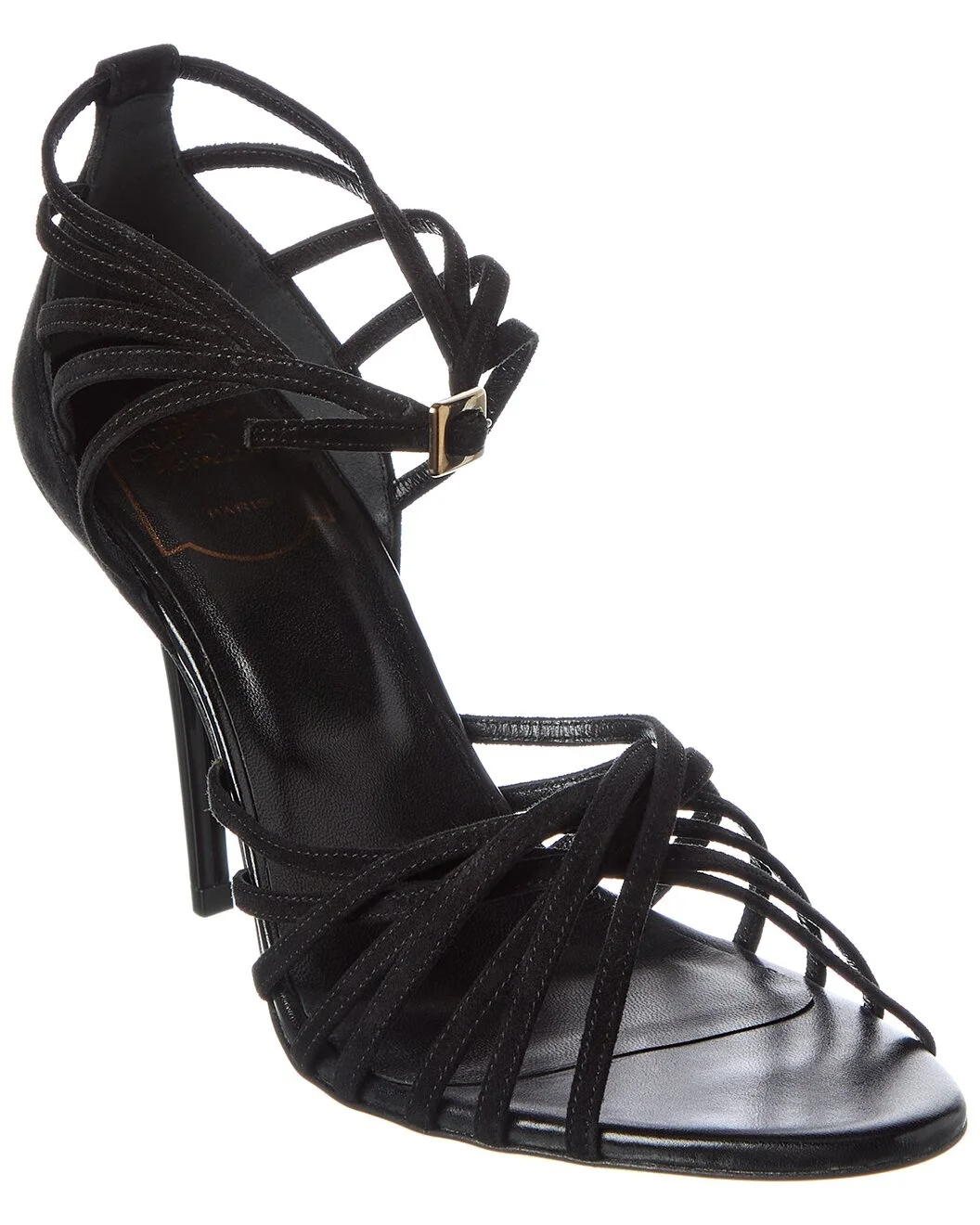 - About the brand: Effortless, timeless elegance. - Please note: Size selections are European. For US conversions, please reference size chart. - Made in Italy - Cage Suede Sandal in black suede and gold-tone hardware - Buckle closure - Lightly padded leather insole - Smooth leather sole - 4.5in heel - Please note: All measurements are approximate and were taken from a size 37; slight variations may occur. - Our products are 100% genuine. In some cases we purchase merchandise from trusted independent suppliers and not directly from the brand owner. In all cases we stand by the authenticity of every product sold on our site.