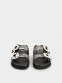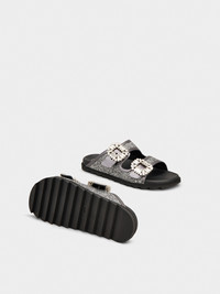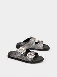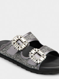 Characterized by shiny crystal buckles, these double band mules are a true must-have for the warmest months. Crafted in lurex mix fabric with metallic leather piping, they interpret a relaxed and sophisticated style at once. Description & details Lurex mix fabric Calfskin leather detailing Crystal buckles Glitter effect leather insole Rubber outer sole Made in Italy Mod: RVW45839610TPK156F