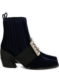 80mm embellished velvet ankle boots Highlights - Dark blue - Velvet texture - Embellished buckle - Black strap - Block heel Made in Italy Composition Sole: Rubber 100% Outer: Velvet 100% Lining: Leather 100% SIZE & FIT Measurement HEEL 3.14 in(8 cm)