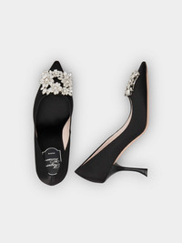 As the true star of your evening look, these daring pumps in satin, reveal the new Bouquet Strass buckle. Crafted with Swarovski, hand-set crystals, the buckle draws inspiration from antique, French jewellery shops. This new creation celebrates sophisticated and precious femininity. Description & details Made in Italy Satin upper Lacquered heel 3.3 ins Leather outsole Maintenance and care cards included Branded dustbag Mod: RVW53028020RS0B999