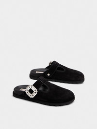 Perfect combination of comfort and femininity, the Slidy Viv' style features a decontractee allure. Characterized by a serrated outer sole, these mules in suede with T-strap are adorned by the iconic crystal buckle. FEATURES - Calfskin suede - Crystal buckle - Leather insole - Rubber outer sole - Made in Italy RVW62542100HG0B999