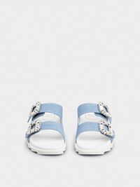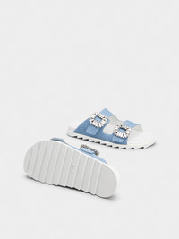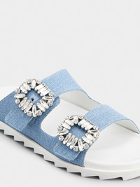 Characterized by shiny crystal buckles, the Slidy Viv' Strass Buckle Mules are a true must-have for the warmest months. Handcrafted in denim, they reinterpret the casual style with a distinctive Vivier touch. Description & details Made in Italy Cotton upper Crystal buckles Leather insole Rubber outsole Maintenance and care cards included Branded dustbag Mod: RVW45818820JDLU207