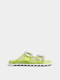 Featuring a double crystal buckle, the Slidy Viv' Strass Buckle mules are a true must-have for the warmer months. Handcrafted in a refined net fabric with leather piping, they reinterpret casual style with a distinctive Vivier touch. Description & details Made in Italy Net fabric upper Leather inserts Crystal buckles Molded insole Rubber outsole Maintenance and care cards included Branded dustbag Mod: RVW45834360O8I0VQ1