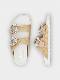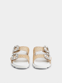 Characterized by crystal buckles, the Slidy Viv' Strass Buckle Mules are a true must-have for the warmest months. Crafted in raffia with suede piping, they reinterpret the casual style with a distinctive Vivier touch. Description & details Made in Italy Raffia and net upper Suede piping Crystal buckles Leather insole Rubber outsole Maintenance and care cards included Branded dustbag Mod: RVW45837840RNK5T97