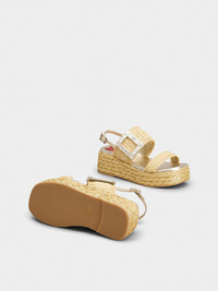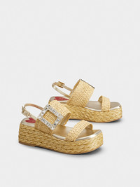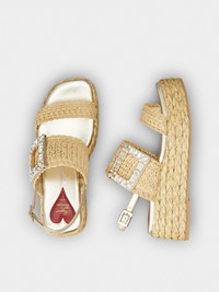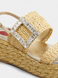 Featuring two straps and a raffia covered wedge, these sandals are adorned with a crystal buckle. Closed with a metallic leather heel strap, this elegant summer creation comes with the emblematic heart on the insole. Description & details Raffia upper Metallic leather inserts Crystal buckle Adjustable heel strap Leather insole with heart-shaped insert Raffia covered wedge Rubber outsole Total height 2.4 ins approx Maintenance and care cards included Branded dustbag Mod: RVW734386605ZT1T26