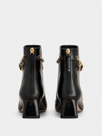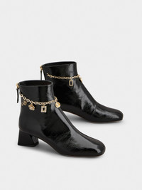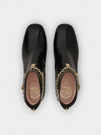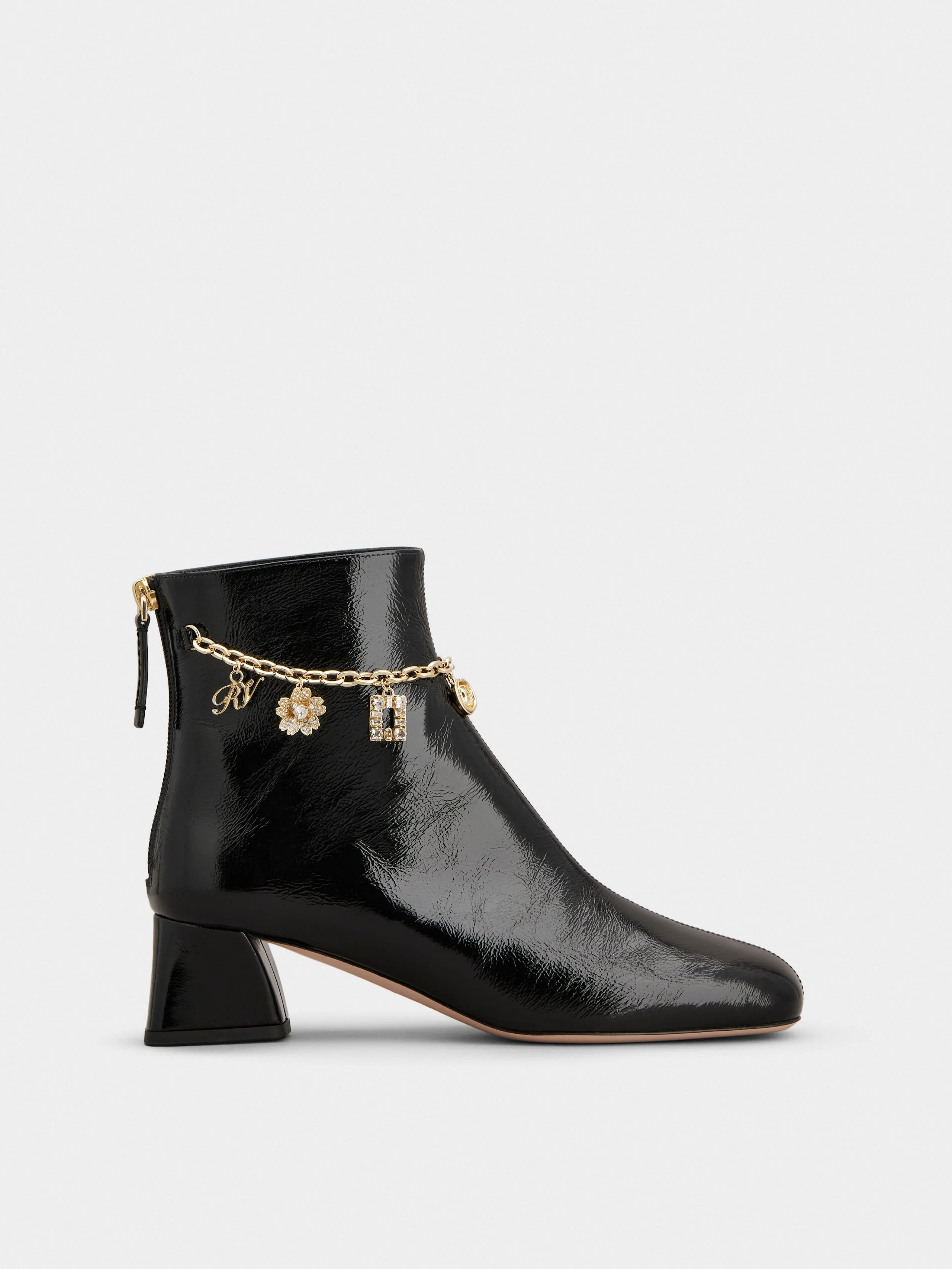 Reminiscent of the Sixties, the Tres Vivier style has become an icon, sophisticated and comfortable at once thanks to the geometric heel. Crafted in patent leather with a zip on the back, these booties are adorned by a chain with branded charms. Description & details Patent calfskin leather Metal charms Crystal detailing Zip on the back Leather lining and insole Leather outer sole Covered geometric heel Heel height 1.8 ins Made in Italy Mod: RVW76543630TM6B999
