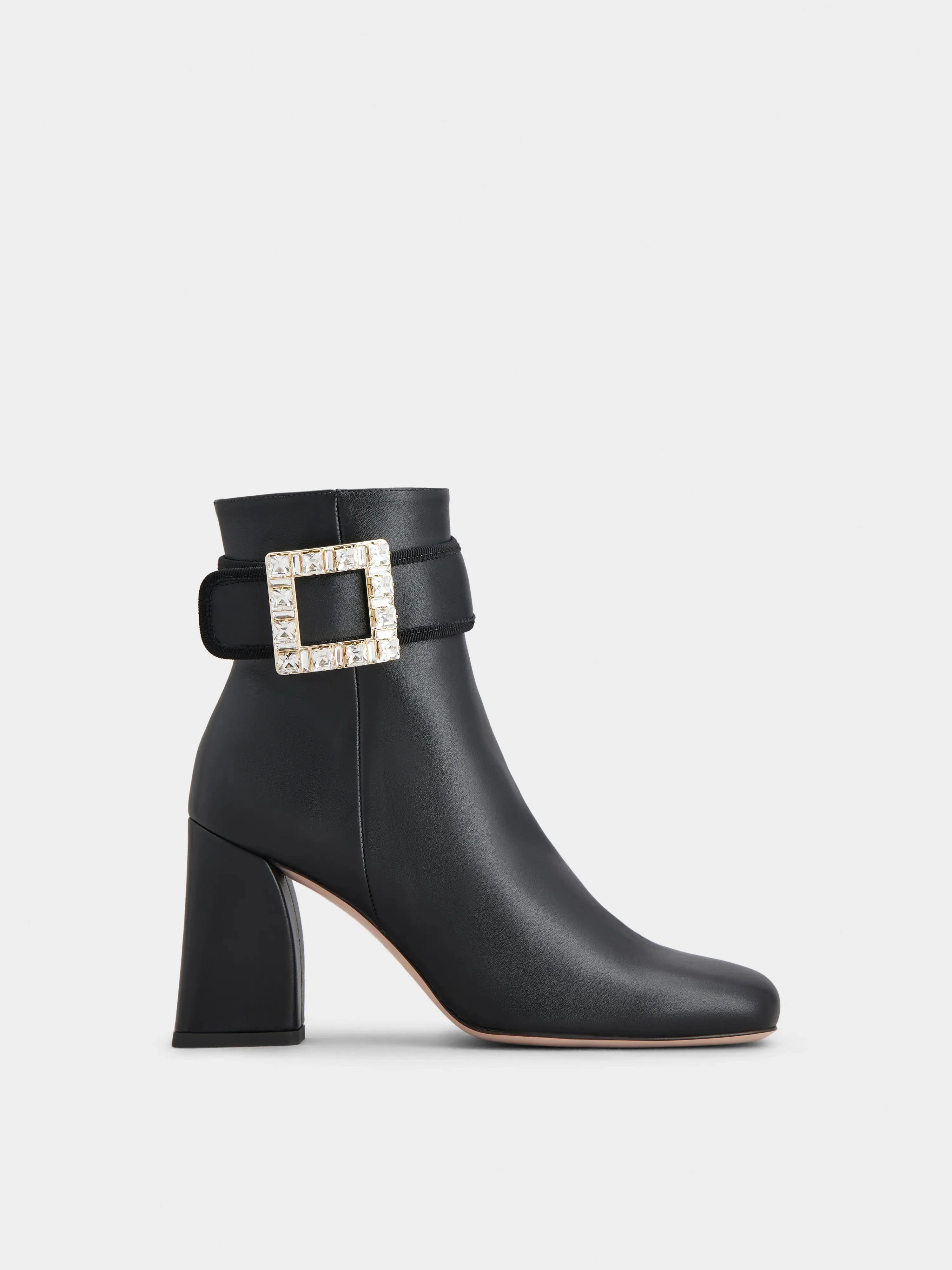 Reminiscent of the Sixties, the Tres Vivier style has become an icon, sophisticated and comfortable at once thanks to the geometric heel. Crafted in leather with grosgrain detailing, these booties come with a shiny crystal buckle. Description & details Calfskin leather Grosgrain detailing Crystal buckle Zip on the inside Leather insole Leather outer sole Covered geometric heel Heel height 3.3 ins Made in Italy Mod: RVW52240540TNRB999