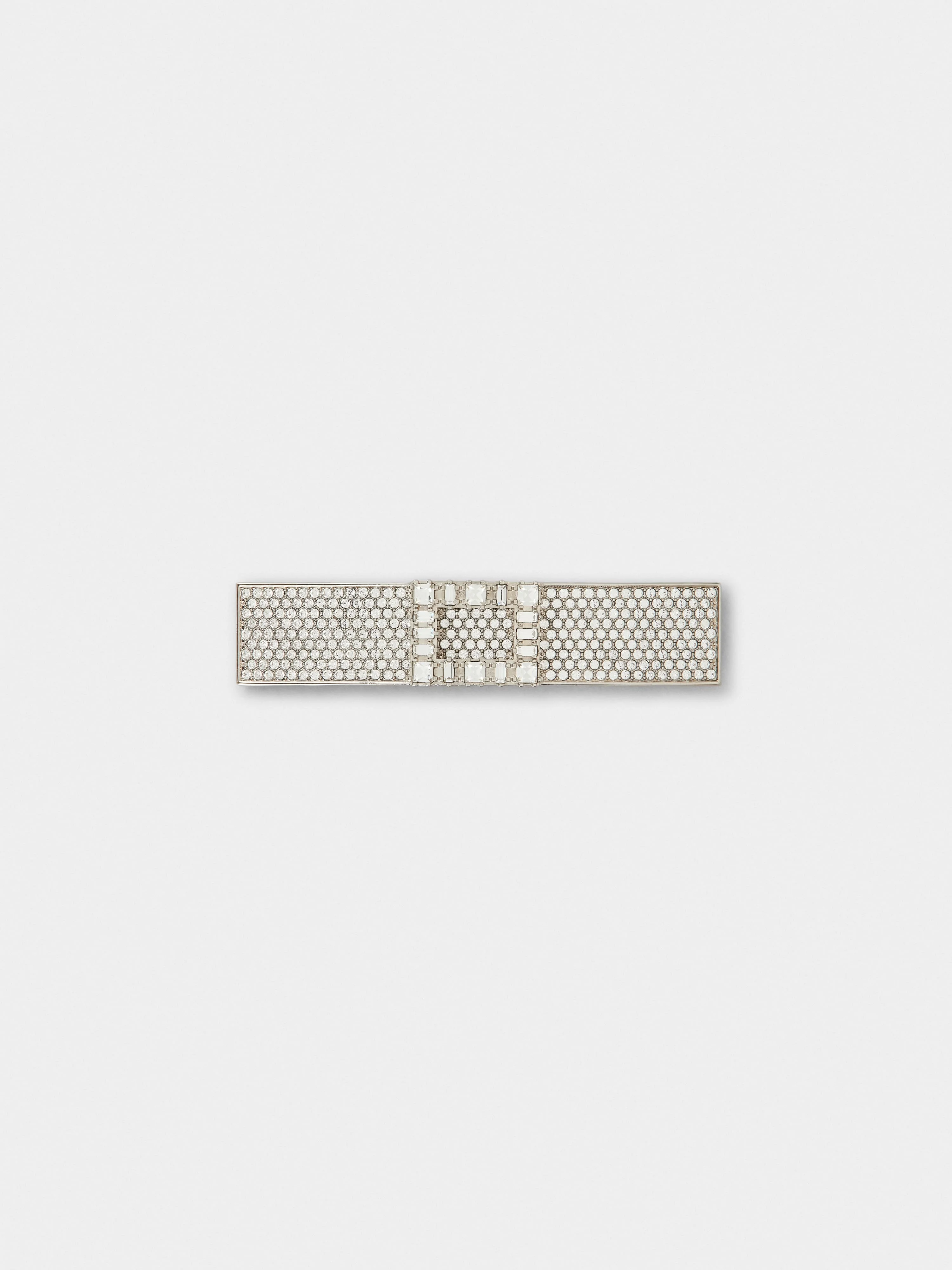 Reminiscent of the Sixties, the Tres Vivier buckle has become an icon. It is the central element of this hair clip with a shiny crystal pave. A precious touch to the hairstyle. Description & details Dimensions: 3.7 x 0.8 x 0.6 ins Hypoallergenic metal and crystals RV logo engraved on the back Made in Italy Mod: REWAC690100AGKB200
