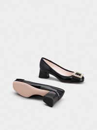 Reminiscent of the Sixties, the Tres Vivier style has become an icon, sophisticated and comfortable at once thanks to the geometric heel. Crafted in patent leather with grosgrain detailing, these pumps feature a shiny crystal buckle. Description & details Patent calfskin leather Grosgrain detailing Crystal buckle Leather insole Leather outer sole Geometric heel Heel height 1.8 ins Made in Italy Mod: RVW51935720TM6B999