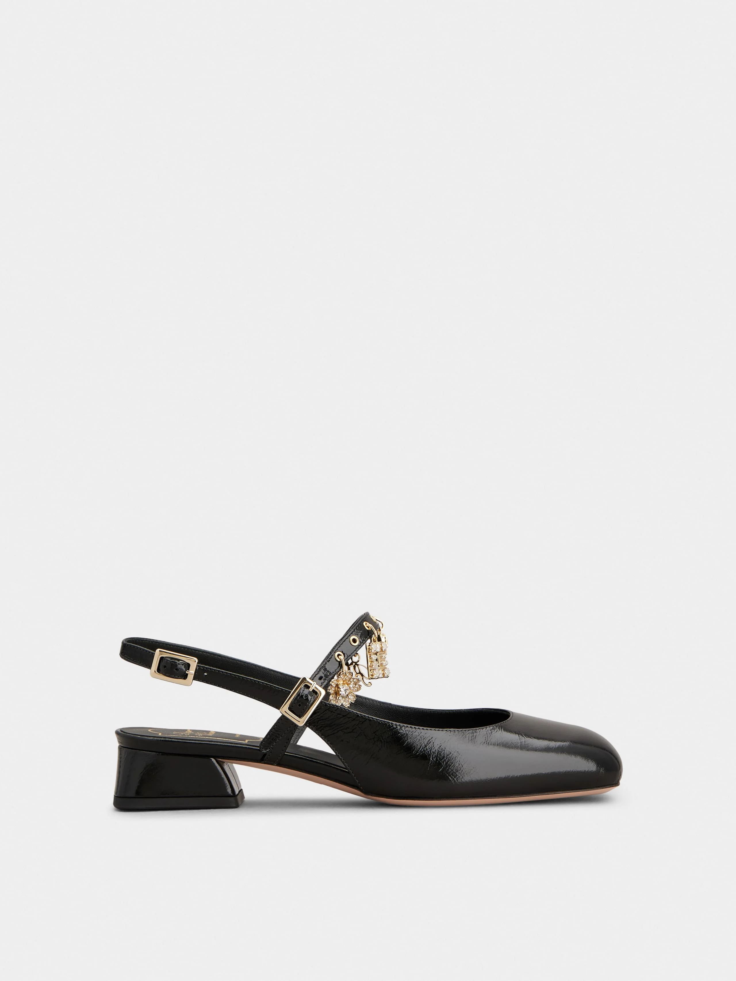 Reminiscent of the Sixties, the Tres Vivier style has become an icon, sophisticated and comfortable at once thanks to the geometric heel. Crafted in patent leather, these slingback ballerinas are adorned by branded charms on the front strap. FEATURES - Patent calfskin leather - Front strap - Crystal branded charms - Heel strap - Leather insole - Leather outer sole - Geometric heel - Heel height 1 in - Made in Italy RVW76443920TM6B999