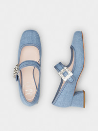 Inspired by the Belle Vivier, the Très Vivier collection is now an icon on its own. Crafted in denim with grosgrain piping, the Très Vivier Strass Buckle Babies Pumps come with a strap embellished with the signature crystal buckle. Sophisticated and comfortable at once, thanks to the geometric heel with Sixties references. Description & details Made in Italy Cotton upper Grosgrain piping Rounded toe Front strap Crystal buckle Leather insole Heel 1.8 ins Leather outsole Maintenance and care cards included Branded dustbag Mod: RVW51936130JDLU207