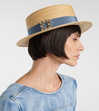 The Tres Vivier boater hat from Roger Vivier offers a sophisticated finishing touch. The design is made from straw with a grosgrain ribbon and the brand's dazzling crystal-embellished buckle. Product Details - Material: 100% straw - Care instructions: do not wash - Made in Italy - Designer color name: Altraversione - Item color: beige - Trim: 55% cotton, 45% viscose - Includes: dust bag - Item number: P01059325 Size & Fit - Circumference size M 56cm-22" - Width of brim 5,5cm-2"