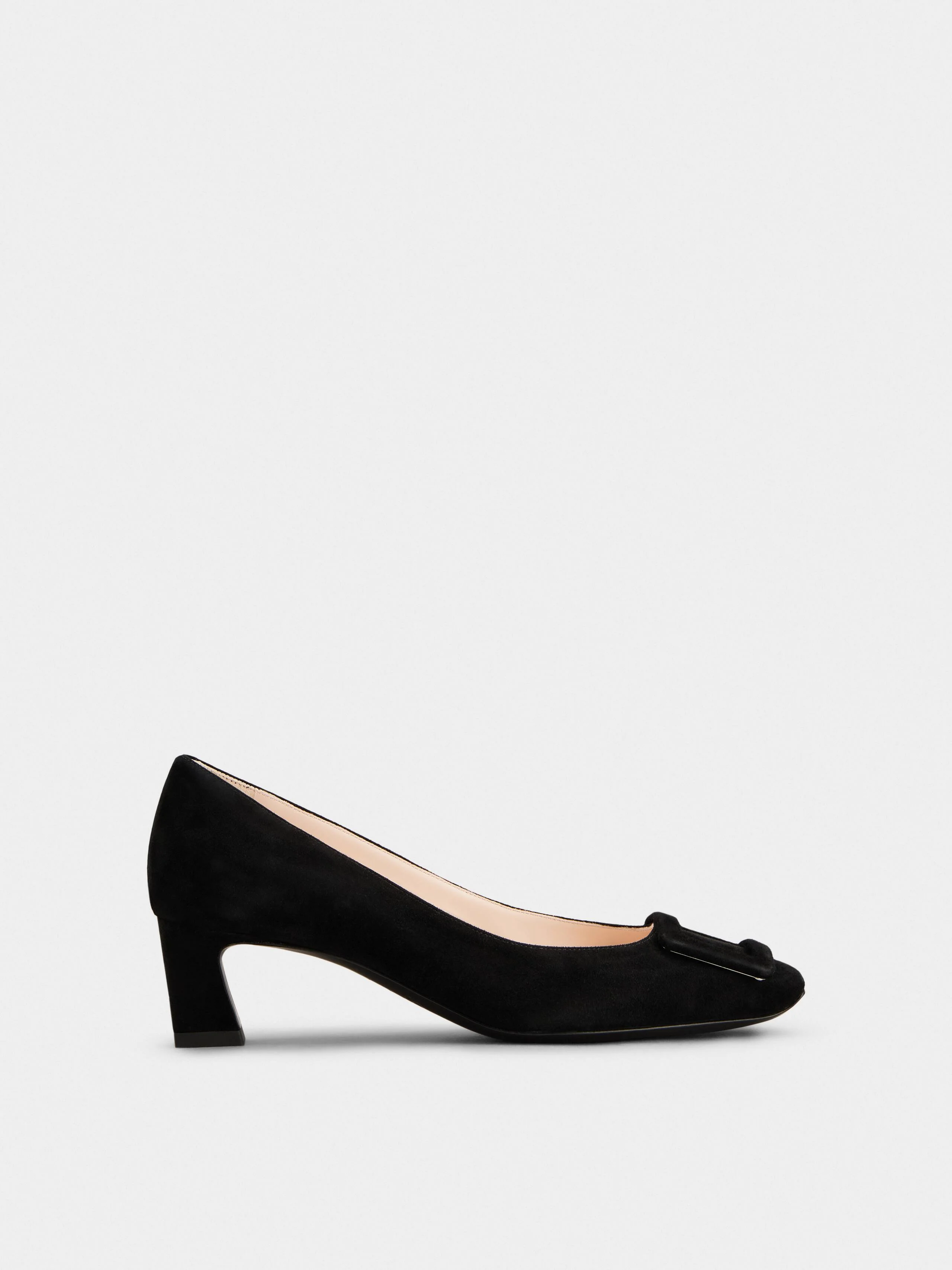 Inspired by the emblematic Belle Vivier buckle, these pumps feature a Trompette heel, with a slightly flared curved shape. Handcrafted in suede, they are the ally of an elegant femininity and accompany you throughout the day without sacrificing comfort. Description & details Goatskin suede Covered buckle Leather insole Leather outer sole Covered Trompette heel Heel height 1.8 ins Made in Italy Mod: RVW44826800HR0B999