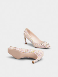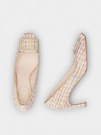 Inspired by the 1970s, the Trompette heel interprets a precise style statement with its curved shape that widens slightly downward. Handcrafted in bouclé fabric with metallic piping, the Trompette Metal Buckle Pumps come with this distinctive sign of the Maison. A true timeless must-have, with an iconic silhouette. Description & details Made in Italy Lurex blend bouclé fabric upper Metallic nappa leather detailing Squared toe Branded metal buckle Leather insole Trompette heel 2.8 ins Leather outsole Maintenance and care cards included Branded dustbag Mod: RVW40026290T51023Z