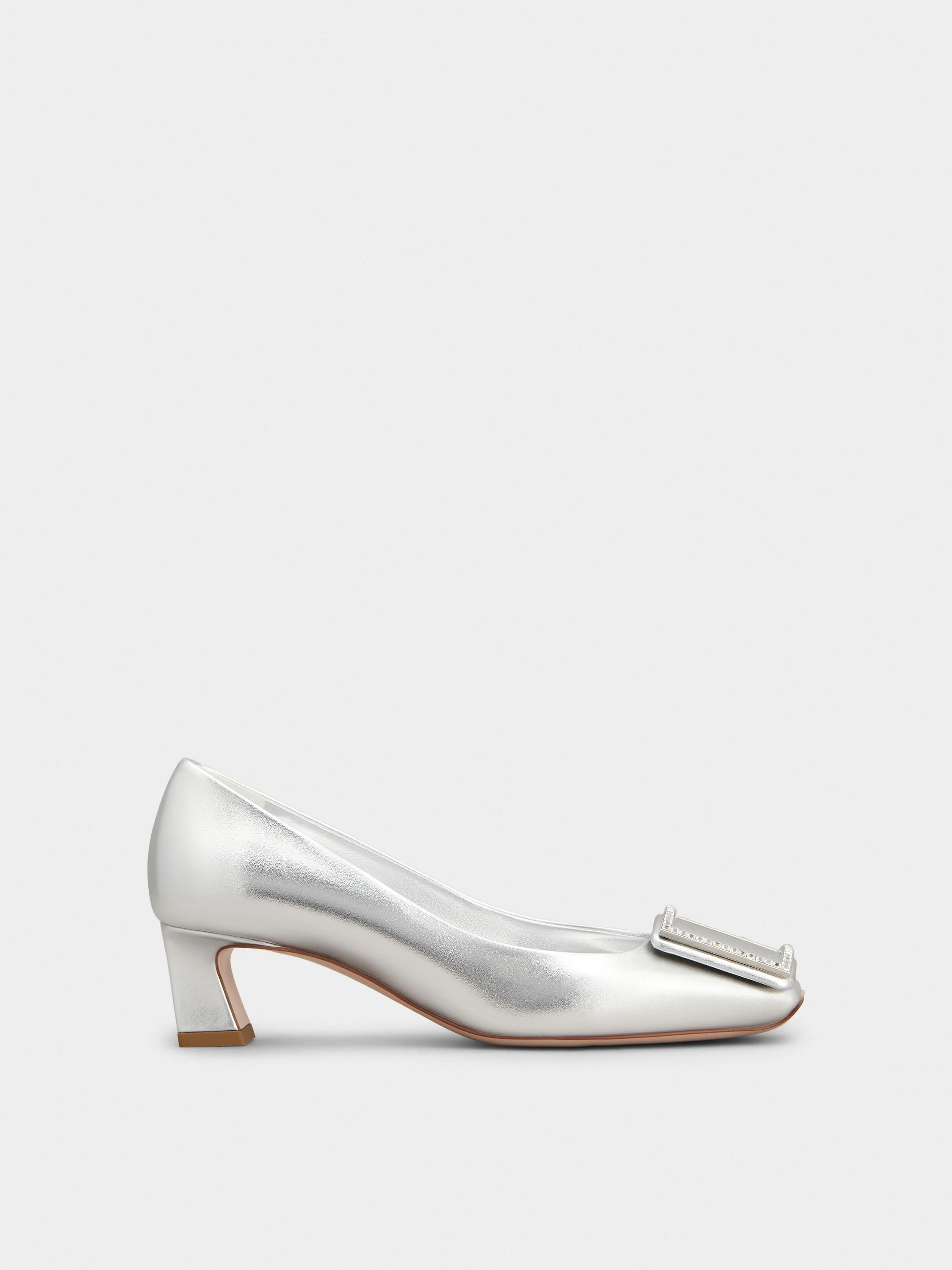 Inspired by the emblematic Belle Vivier buckle, these pumps feature a Trompette heel, with a slightly flared curved shape. Handcrafted in metallic nappa leather, they are the ally of an elegant femininity and accompany you throughout the day without sacrificing comfort. Description & details Calfskin nappa leather Metallic finishing Crystal buckle Leather insole Leather outer sole Covered Trompette heel Heel height 1.8 ins Made in Italy Mod: RVW44844010KACB200