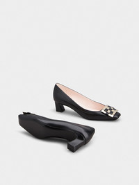 Characterized by a Trompette heel, with the iconic curved shape, these pumps feature a woven buckle. Handcrafted in leather, they are the ally of elegant femininity and accompany you throughout the day without sacrificing comfort. Description & details Calfskin leather Metal and leather buckle Leather insole Leather outer sole Covered Trompette heel Heel height 1.8 ins Made in Italy Mod: RVW44840940BSSB999