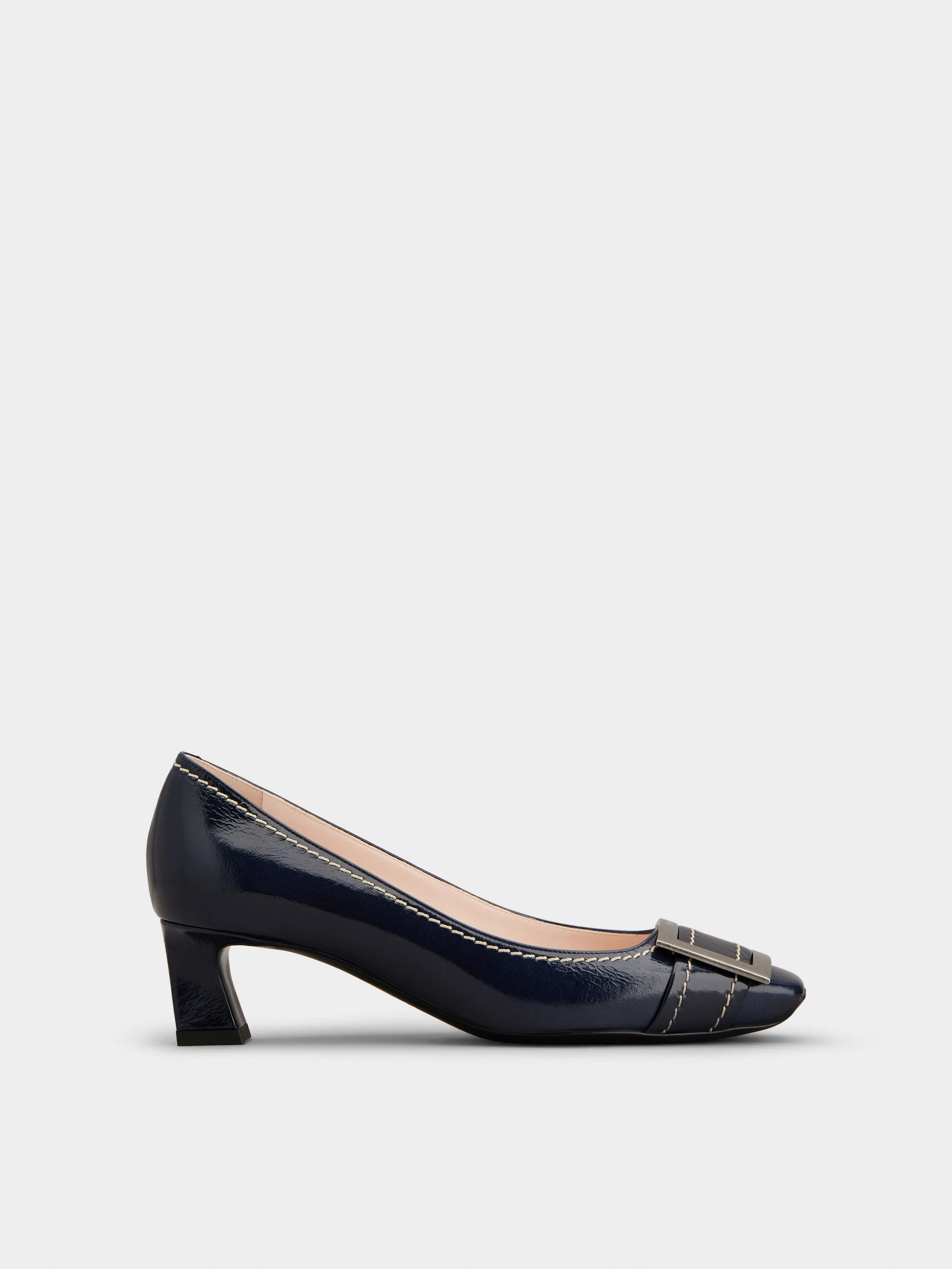 Inspired by the emblematic Belle Vivier buckle, these pumps feature a Trompette heel, with a slightly flared curved shape. Handcrafted in patent leather with exposed stitching, they are the ally of an elegant femininity and accompany you throughout the day without sacrificing comfort. Description & details Patent calfskin leather Metal buckle Leather insole Leather outer sole Covered Trompette heel Heel height 1.8 ins Made in Italy Mod: RVW44841540TM6U807
