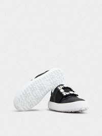 Roger Vivier's new slip-on sneakers feature a fun outsole with a floral pattern on the bottom. The perfect synthesis of urban style trends and functional luxury, this must-have in leather comes with a shiny rhinestone buckle. Description & details Made in Italy Leather upper Elastic strap Rhinestone buckle Leather insole Rubber outsole Maintenance and care cards included Branded dustbag Mod: RVW68734610JUSB999