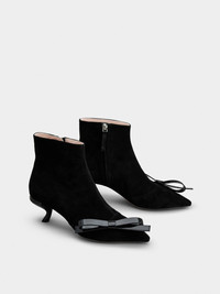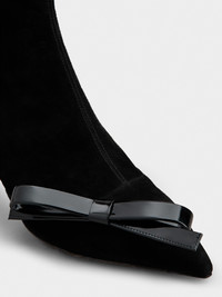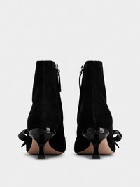The 1963 Virgule heel, of the homonymous shape, is one of Monsieur Vivier's most famous creations. This emblem of the Maison is the signature element of the Virgule Bow Ankle Boots, handcrafted in suede with an oversized bow in patent leather. Featuring a zip on the inside, they are a precious style with sophisticate femininity. Description & details Made in Italy Suede upper Patent leather detailing Tapered toe Zip on the inside Lacquered Virgule heel 2.2 ins Leather outsole Maintenance and care cards included Branded dustbag included Mod: RVW63837180N5WB999