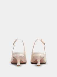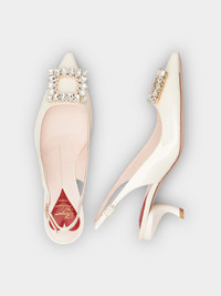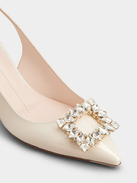 The 1963 Virgule heel, of the homonymous shape, is one of Monsieur Vivier's most famous creations. This emblem of the Maison is the signature element of the Virgule Slingback Pumps. Handcrafted in patent leather, this version is embellished with the new buckle inspired by the creative director Gherardo Felloni's garden. Composed of multi-sized crystals, this enchanting buckle with a floral shape features elements recalling the shape of a lemon. Description & details Made in Italy Patent leather upper Tapered toe Crystal buckle Heel strap Leather insole with heart-shaped detailing Virgule lacquered heel 2.2 ins Leather outer sole Maintenance and care cards included Branded dustbag Mod: RVW63834500D1PC019
